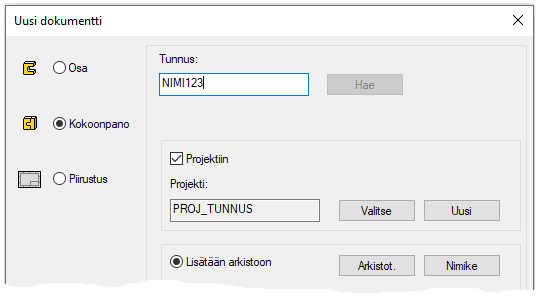 File > Uusi > Kokoonpano. (Anna nimi ja arkistotiedot ja valitse edellä käytetty projekti).