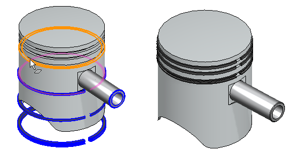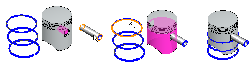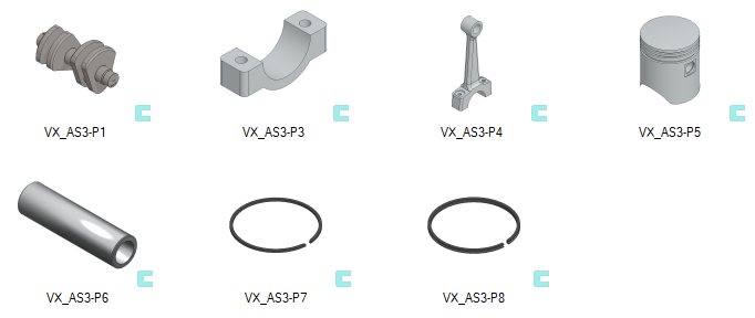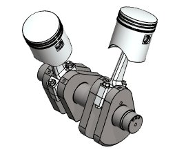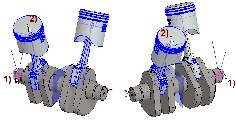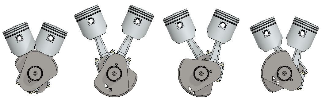 Harjoituksessa lisätään valmiiksi mallinnettuja osia kokoonpanoihin sekä tehdään näistä kokoonpanoista uusia kokoonpanoja. Poistetaan alikokoonpanona toimivan männän ja kiertokangen ehtojen jäädytys, eli sallitaan että alikoonnan ehdot ratkeavat myös pääkoonnassa, jolloin männät liikkuvat aina sylinterin suunnassa riippumatta kiertokangen asennosta. Lopuksi lisätään kulmaehto ja simuloidaan osien liikkumista.