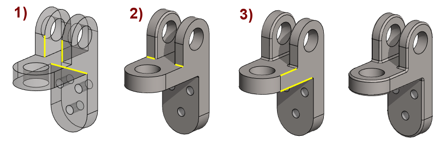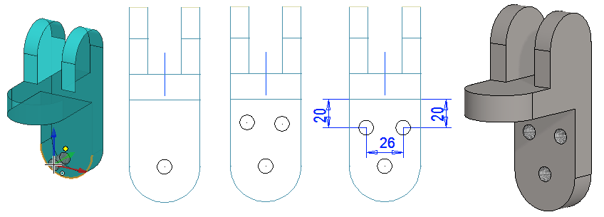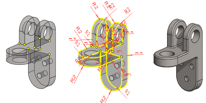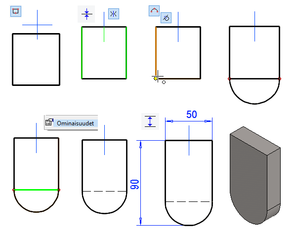 Pyöristykset voit tehdä valittuihin viivoihin toiminnolla Pyöristä/viistä > Pyöristä, jolloin kannattaa miettiä pyöristyksiä siten, että seuraava pyöristys osaa "hakeutua ketjuna" järkevästi eteenpäin. Kuvasarja oikealla.