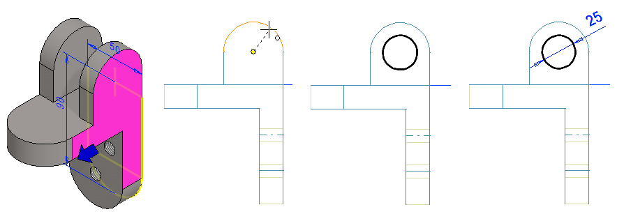Osoita ensimmäisen piirteen paikka siten että se tulee etupinnalle ja siten että se löytää kaaren keskipisteen (Tällöin piirre on tarkasti oikealla paikallaan)