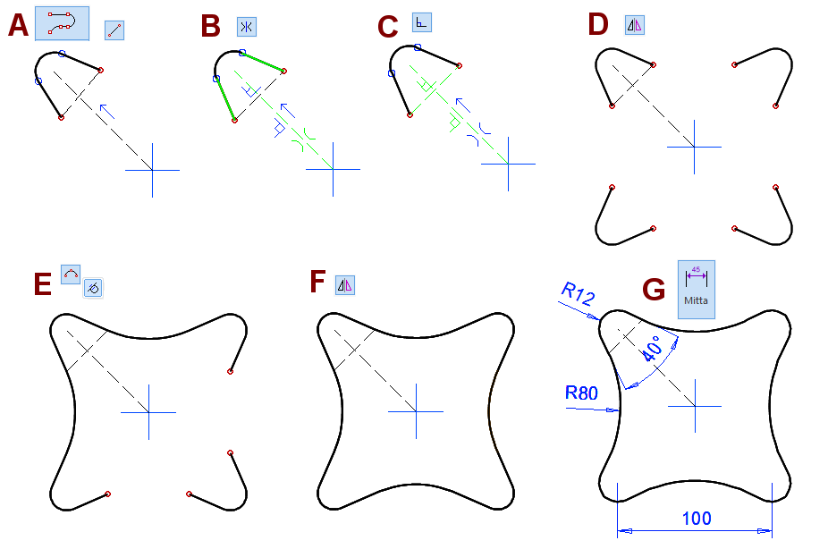 Peilaa tai piirrä tangentiaaliset kaaret. Kuva F.