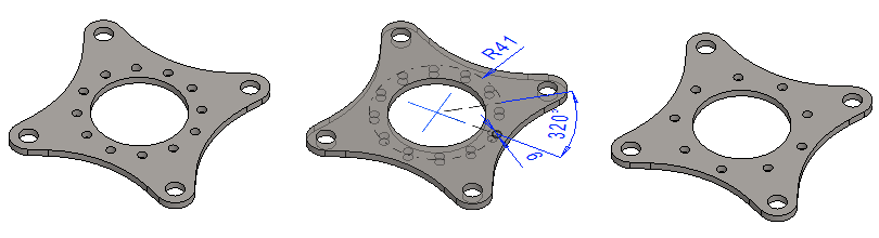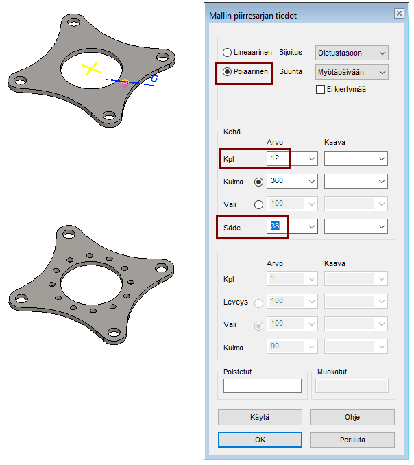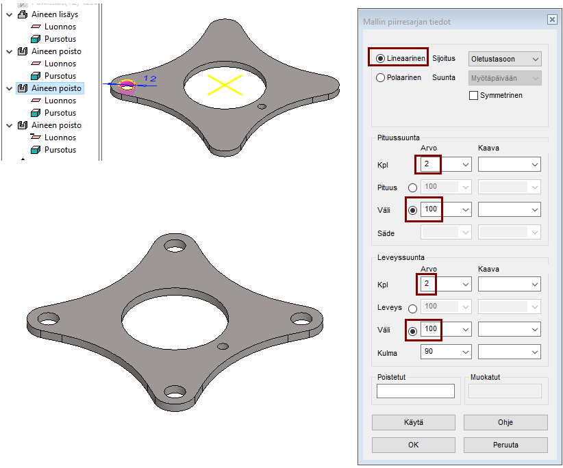 Tämä voidaan toki korjata siten, että ensimmäisen luonnoksen mittojen muutoksen jälkeen muokataan korvakkeiden reikien sarjaa.