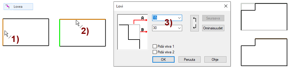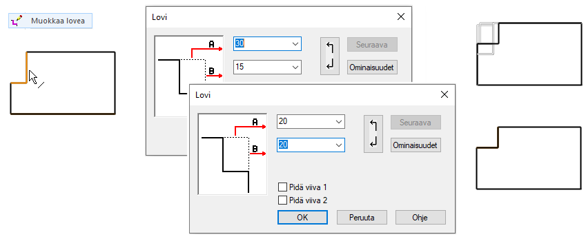 Kun olet antanut loven arvot ja lovi näyttäisi syntyvät "väärin päin", voit painaa kuvassa näkyvää painiketta, joka vaihtaa loven suuntaa.