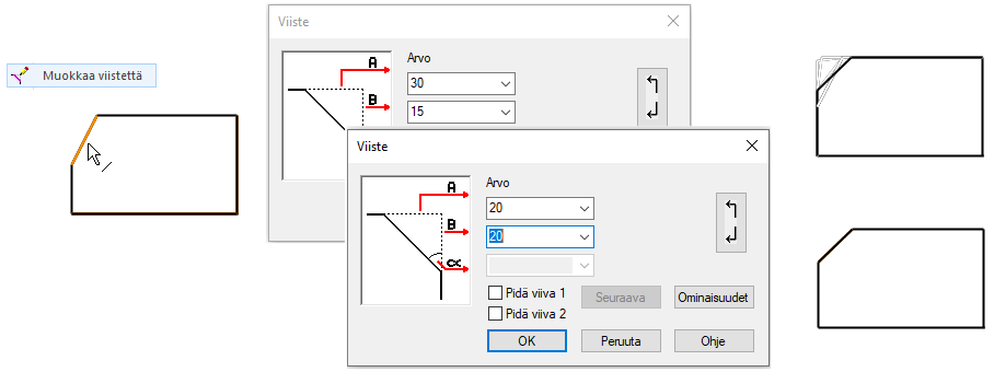 Lisää viiste antamalla viisteen pituudet