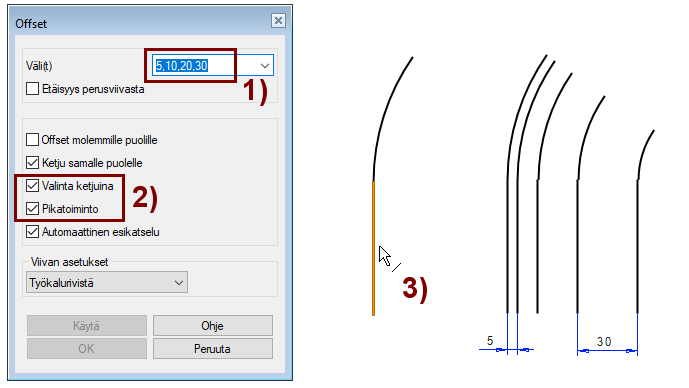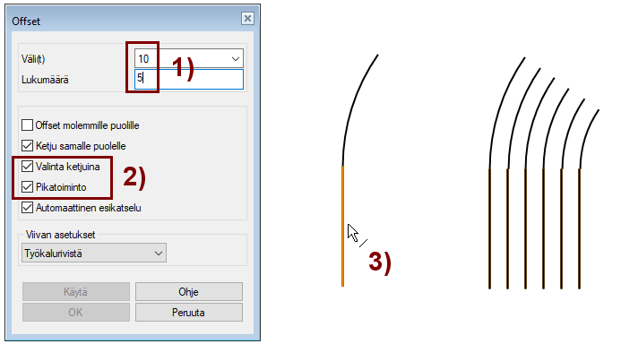 Jos Offset-dialogissa on valittuna optio Pikatoiminto, niin viivan puolta (4) ei tarvitse osoittaa.
