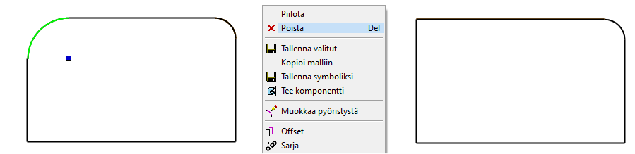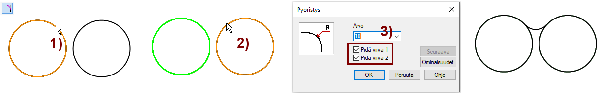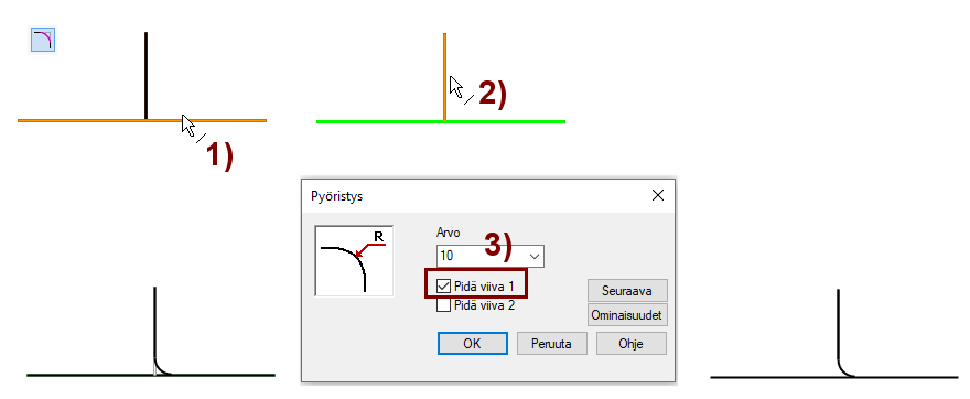 Voit lisätä pyöristyksen myös siten, ettei kumpaakaan viivaa trimmata.