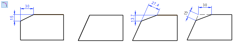 Etäisyysehto lisätään viivan ja pisteen etäisyytenä, joten automaattisesti lisätyt, ja ehtona toimivat mitat, eivät kuvaa syöttämiäsi viisteen arvoja.