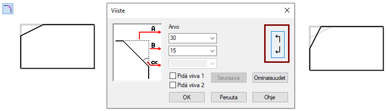 Kun olet antanut viisteen arvot ja viiste näyttäisi syntyvät "väärin päin", voit painaa kuvassa näkyvää painiketta, joka vaihtaa viisteen suuntaa.