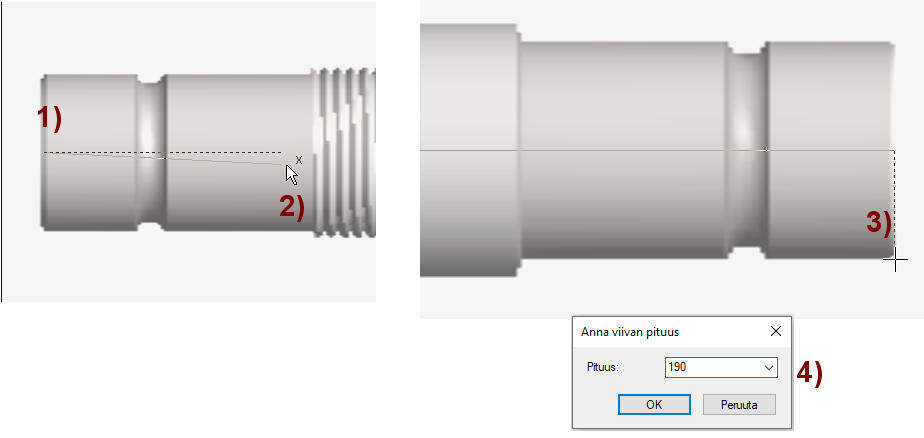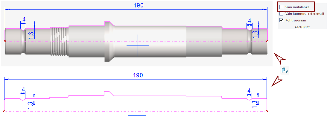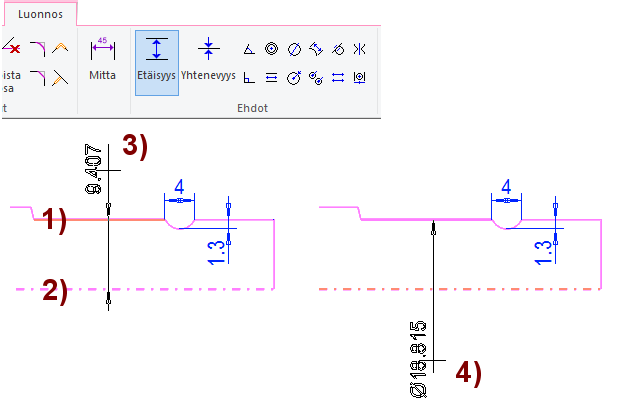 Jos kohdistin on keskiviivaan nähden toisella puolella kuin muotoviiva, ohjelma ehdottaa halkaisijaa, kuvassa 4).