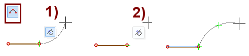 Kolmen pisteen kaari voidaan piirtää lähtögeometrialle tangentiaalisesti tai ei tangentiaalisesti.