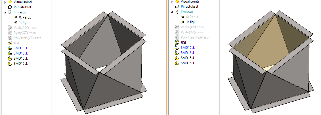 Taivutuskulma voitaisi myös osoittaa, jos JIGI-osaan olisi mallinnettu ohjausviivat pohjan ja yläpinnan tasoon.