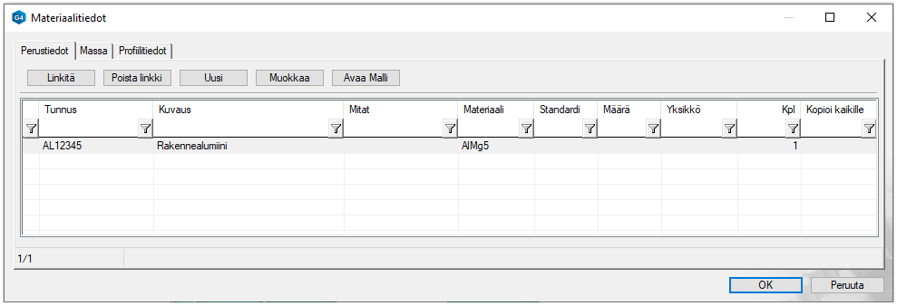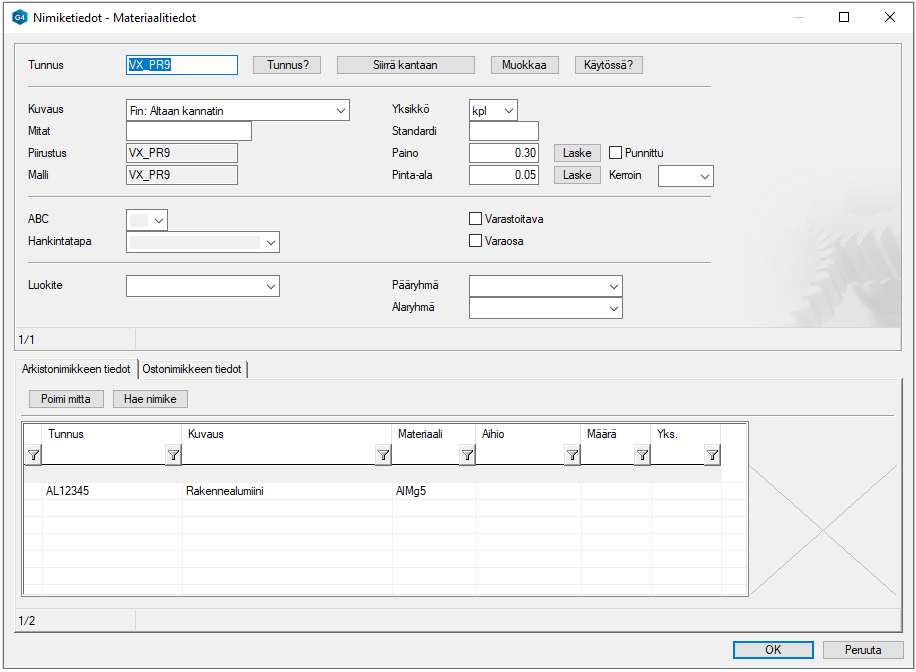 Valintanauhan toiminto (Työkalut) Materiaali avaa Materiaalitiedot-dialogin, jonne voit syöttää tai hakea raaka-ainetta koskevan materiaalitiedon.
