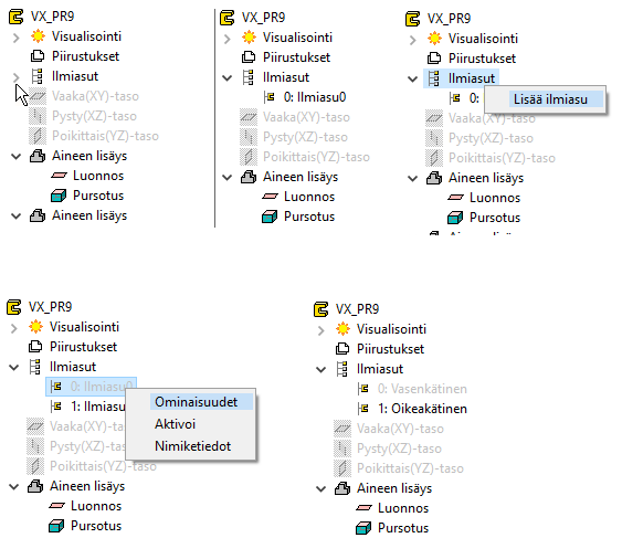 Valitse piirrepuusta kohta Ilmiasut, jolloin näet mallissa olevat ilmiasut.