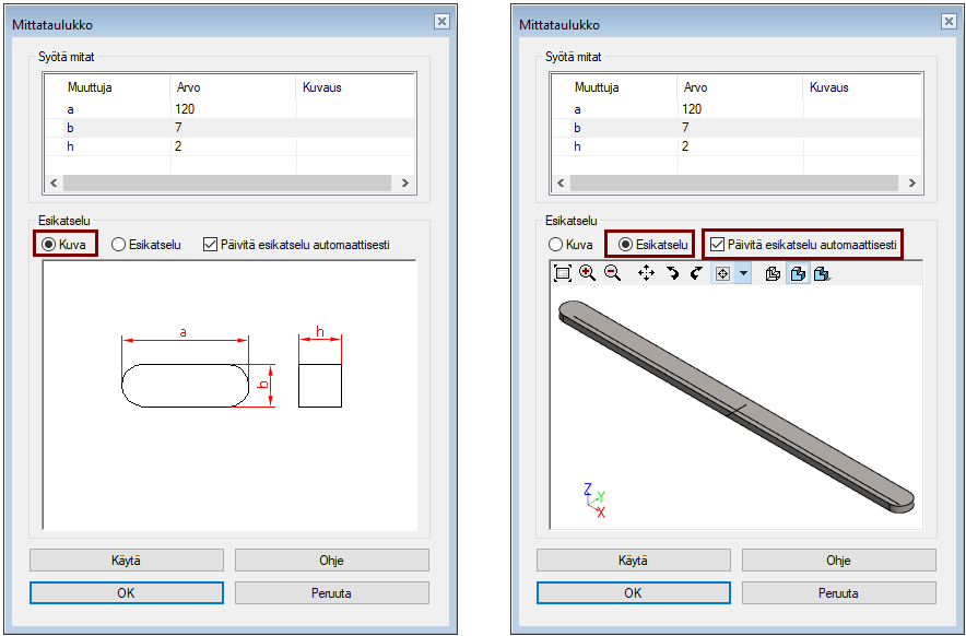 Jos valinta Päivitä esikatselukuva automaattisesti on valittu, niin samalla, kun syötät mittoja, malli muuttuu.