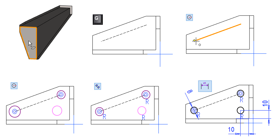 Valitse asennusreikä-piirre (joko piirrepuusta tai osoittamalla reiästä yksi pinta).
