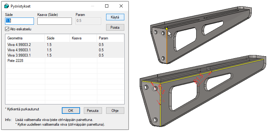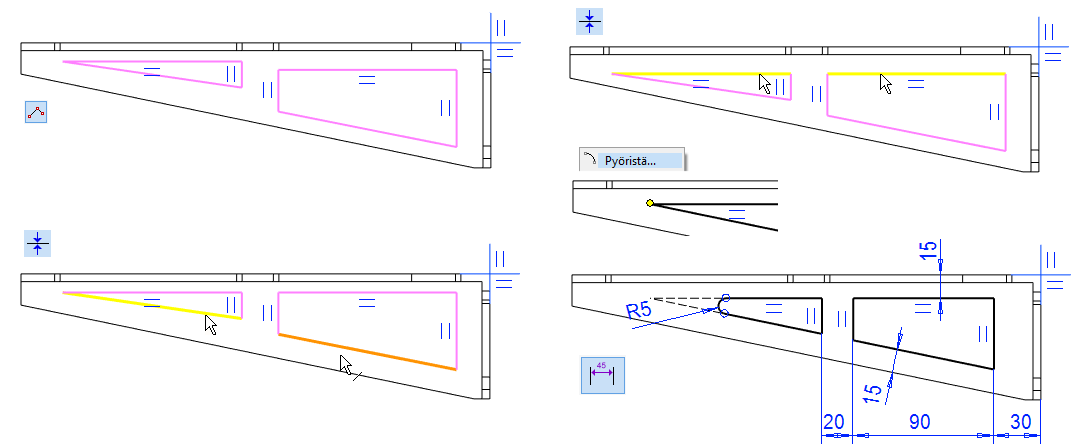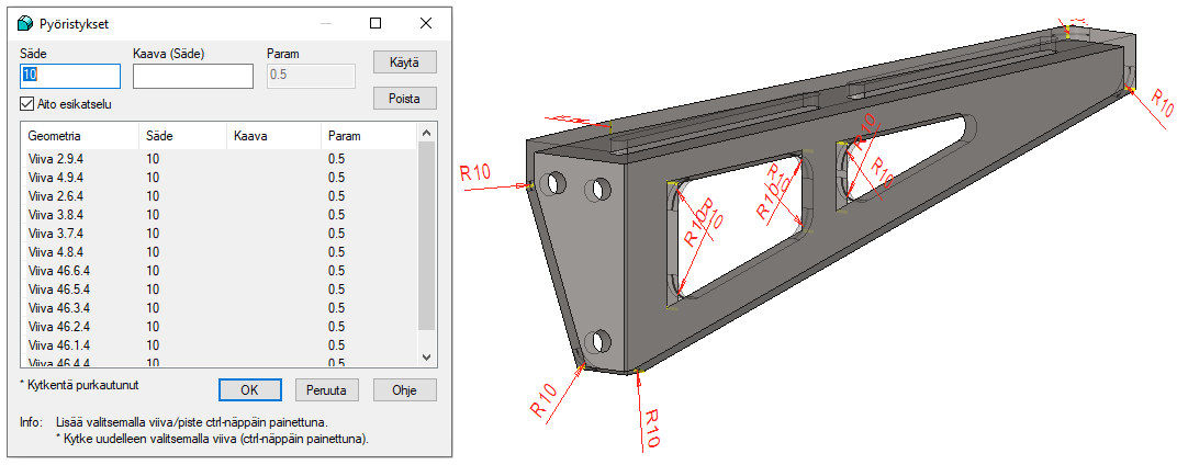 Valitsemalla yhden viivan, saat pyöristettyä kaikki "sisäpinnan" särmät.