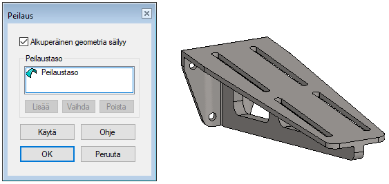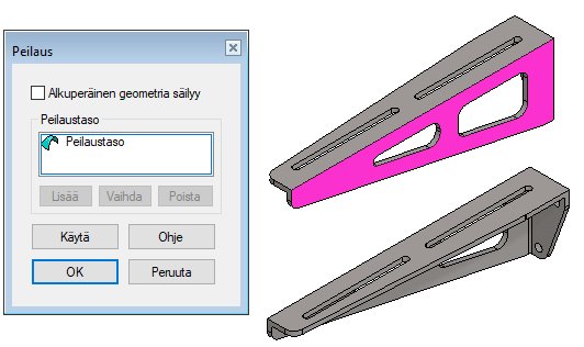 Huomaa, että pinnan valinnan jälkeen saatava tilannekohtainen toiminto Peilaa piirre peilaa vain sen piirteen, jonka pinta oli valittu.