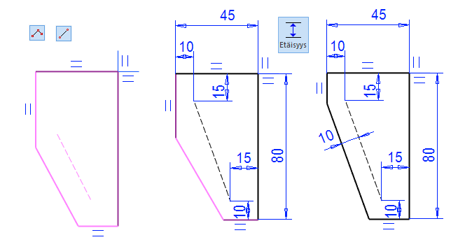 Lisää muut mitat (10 ja 15) siten että mitan toisena osapuolena on apuviiva tai apuviivan päätepiste.