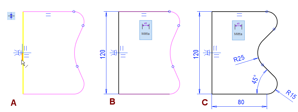 Mitta-toiminnon sijaan voit käyttää myös ehtoja Etäisyys, Kulma ja Säde.
