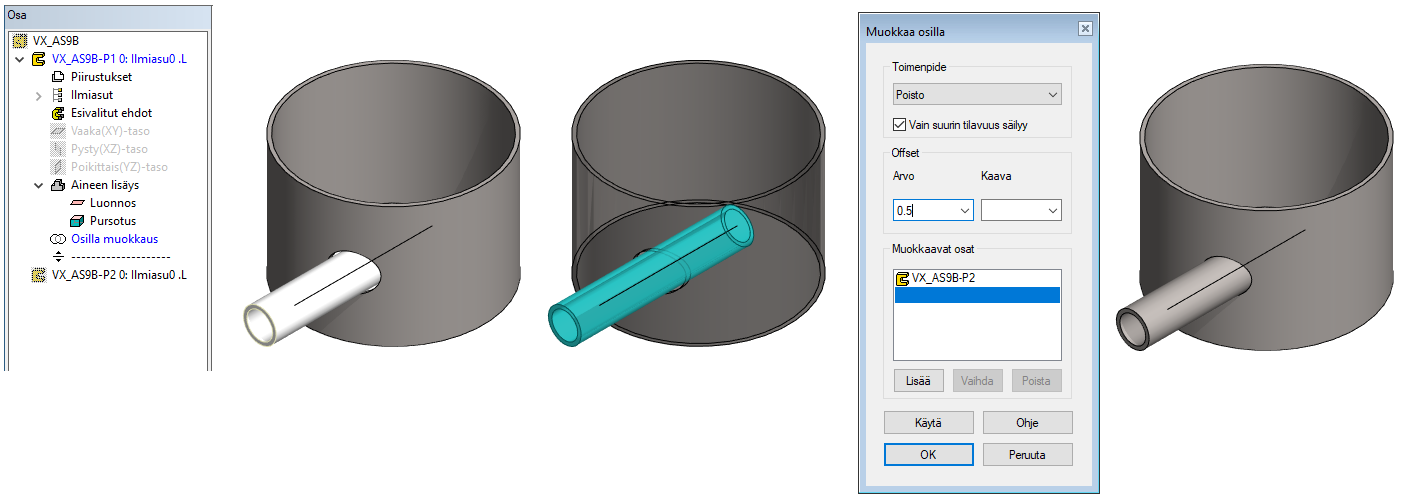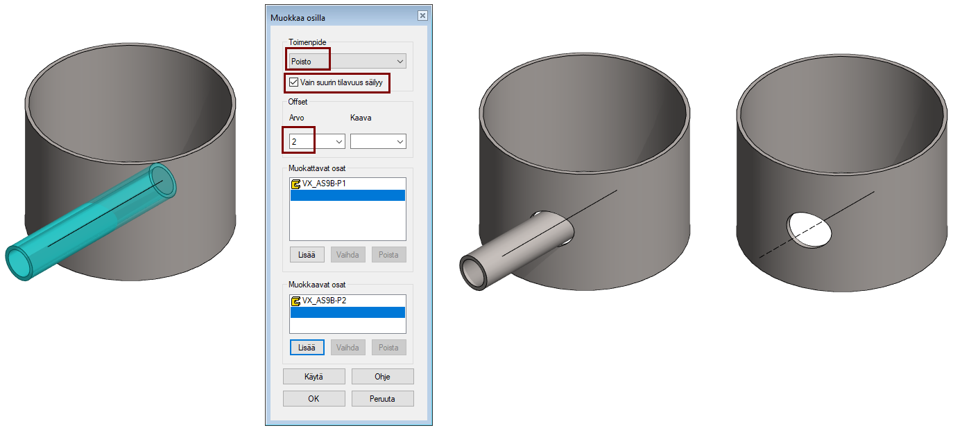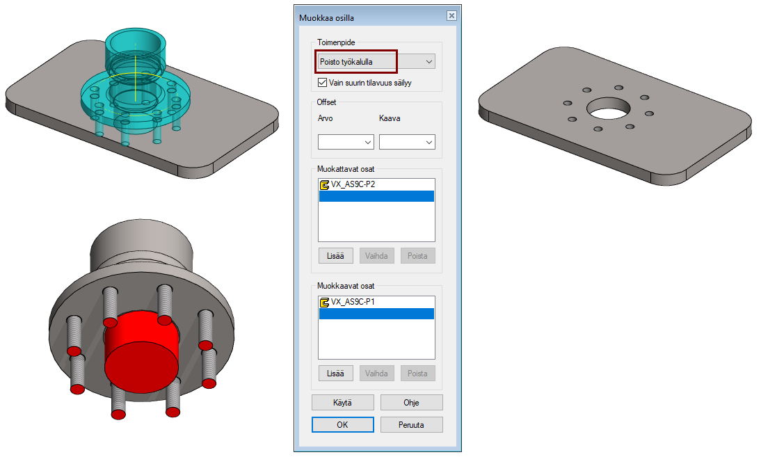 Poisto työkalulla = Osasta poistetaan toisessa osassa oleva työkalu-geometria.