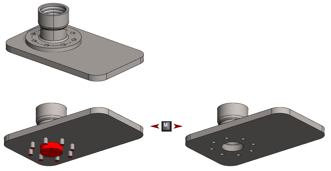 Toiminto: Ratkaise (valintanauhassa tai tilannekohtaisessa valikossa) koneistaa reiät uuteen sijaintiin.