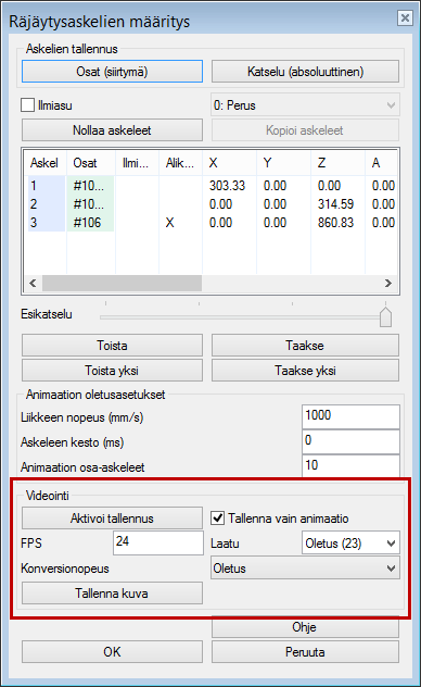 Näistä liikeradoista voidaan tallentaa video-esitys.