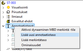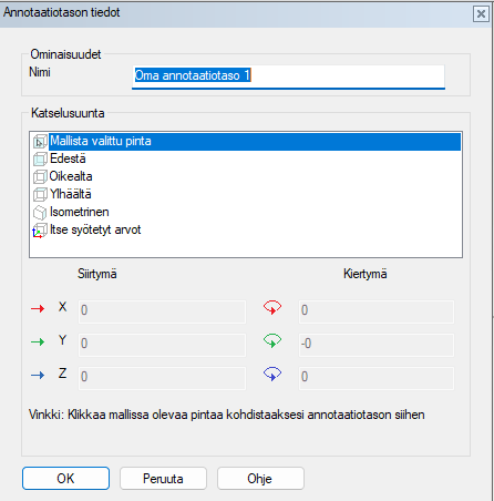 Valitse oikealla näppäimellä osan tai kokoonpanon puusta “Annotaatiotasot”. Tämän jälkeen voit muodostaa uuden annotaatiotason tai merkintätason malliin. Kun lisäät uutta annotaatiotasoa, voit valita pinnan mallista, tai hyödyntää jo olemassa olevia annotaatiotasoja. Voit myös syöttää annotaatiotason itse. Annotaatiotaso kannattaa nimetä käyttötarkoituksen mukaisesti.