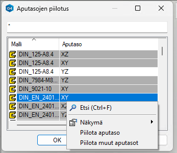 Kun piilotat aputasoja, voit tehdä tekstihaun pintoihin, jotka haluat piilottaa. Näin voi esimerkiksi piilottaa kaikki XY ja XZ -tasot antamalla hakuehdoksi X*. Valittuasi piilotetut aputasot, voit myös käyttää toimintoa “Piilota muut aputasot”.