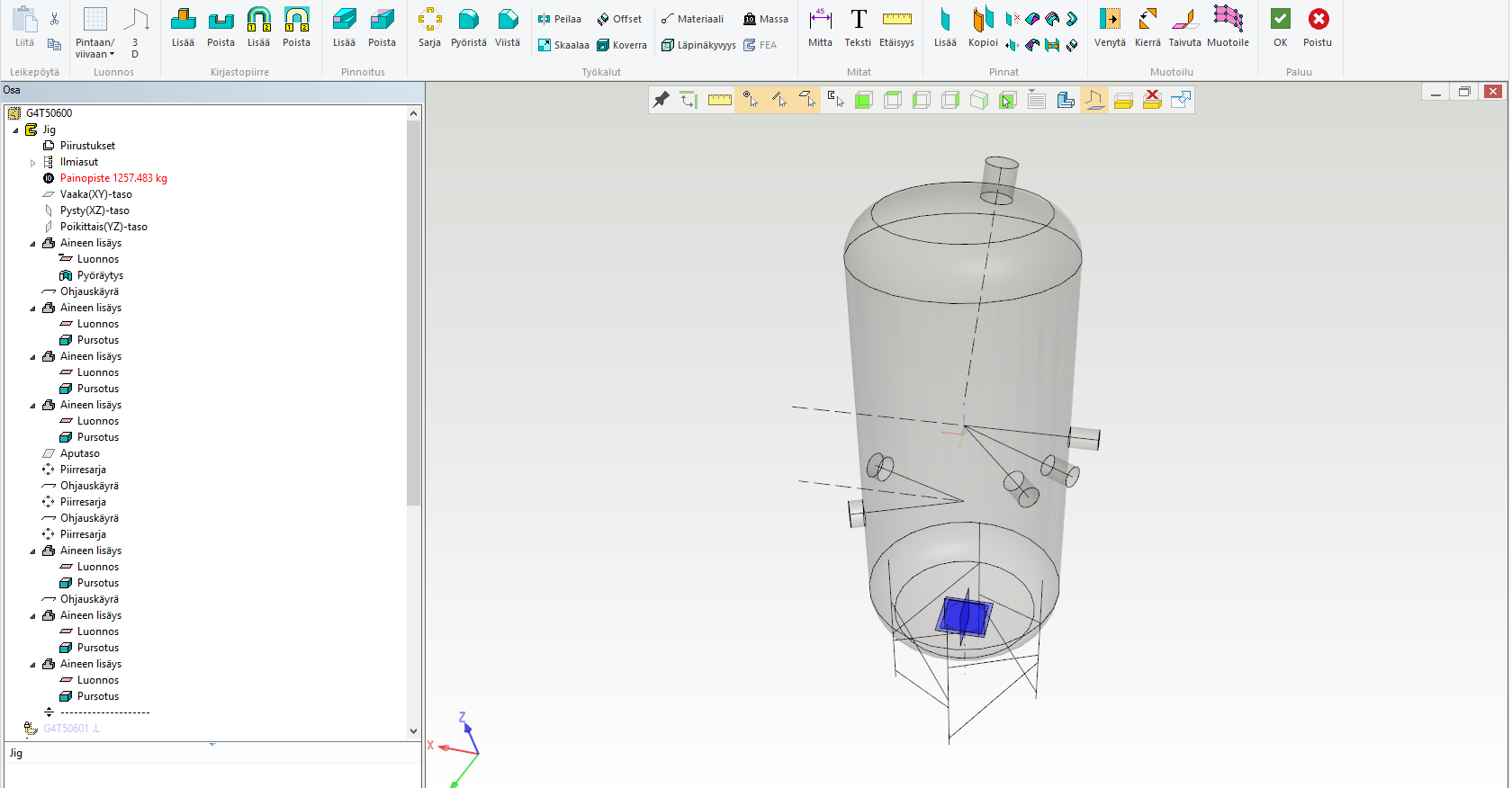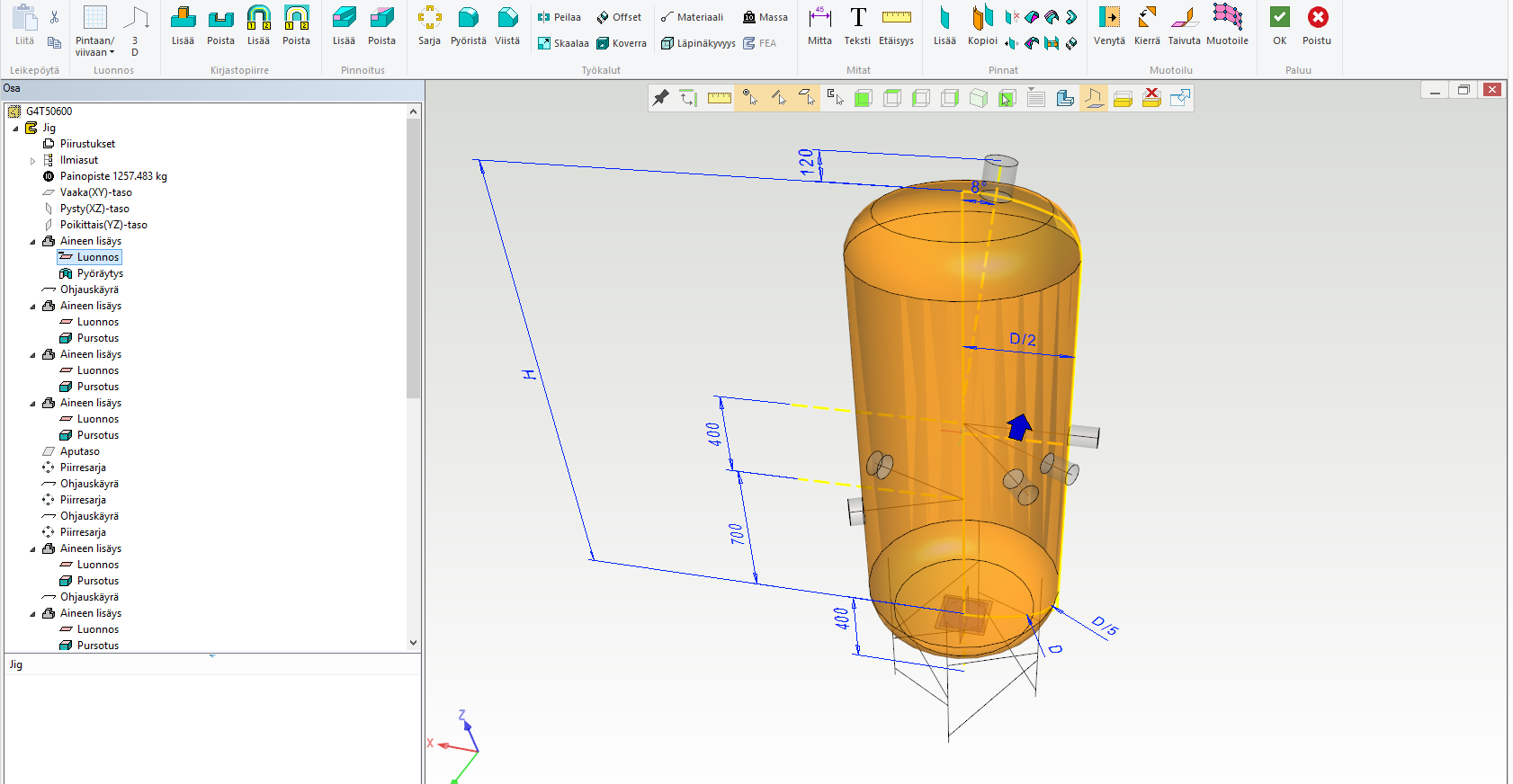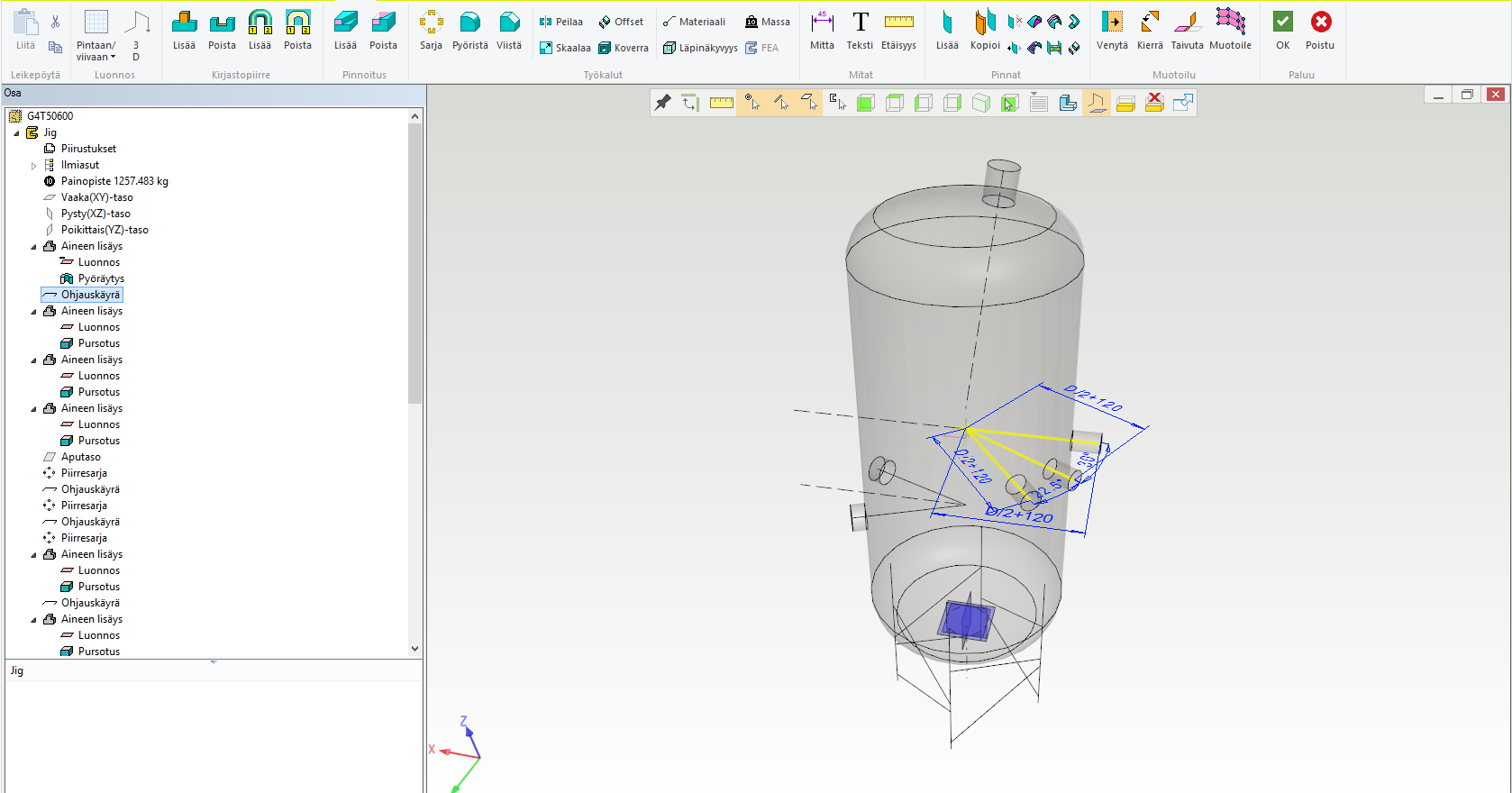 Säiliön osat tehdään samalla tekniikalla kuin kotelomaisissa levyrakenteissa, ts. tehdään uusi osa, kopioidaan siihen jigistä pinta tai pintoja ja offsetoidaan niistä levyosa. Jalkarakenne taas tehdään vetämällä profiiliosia ohjauskäyriä pitkin.