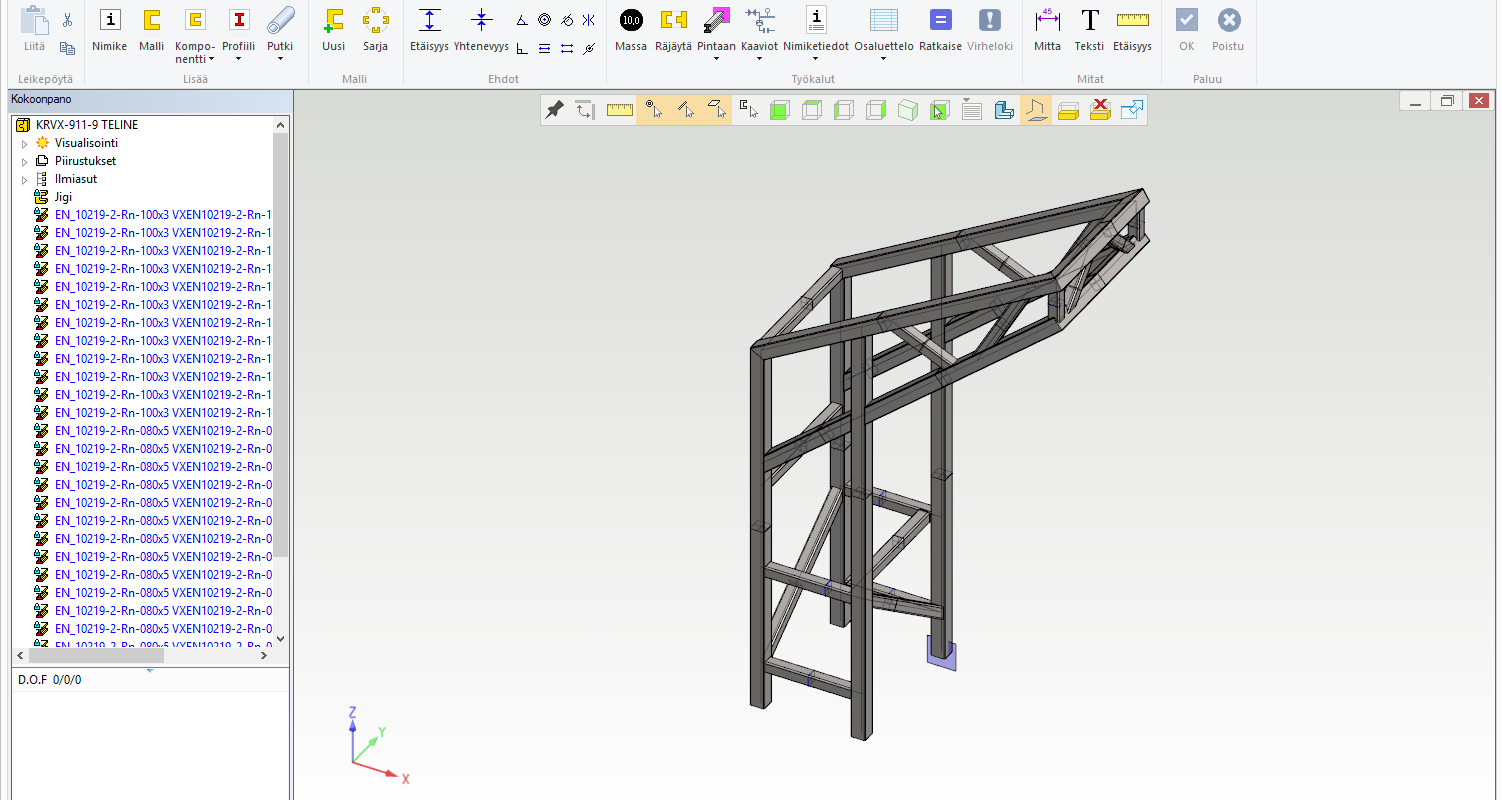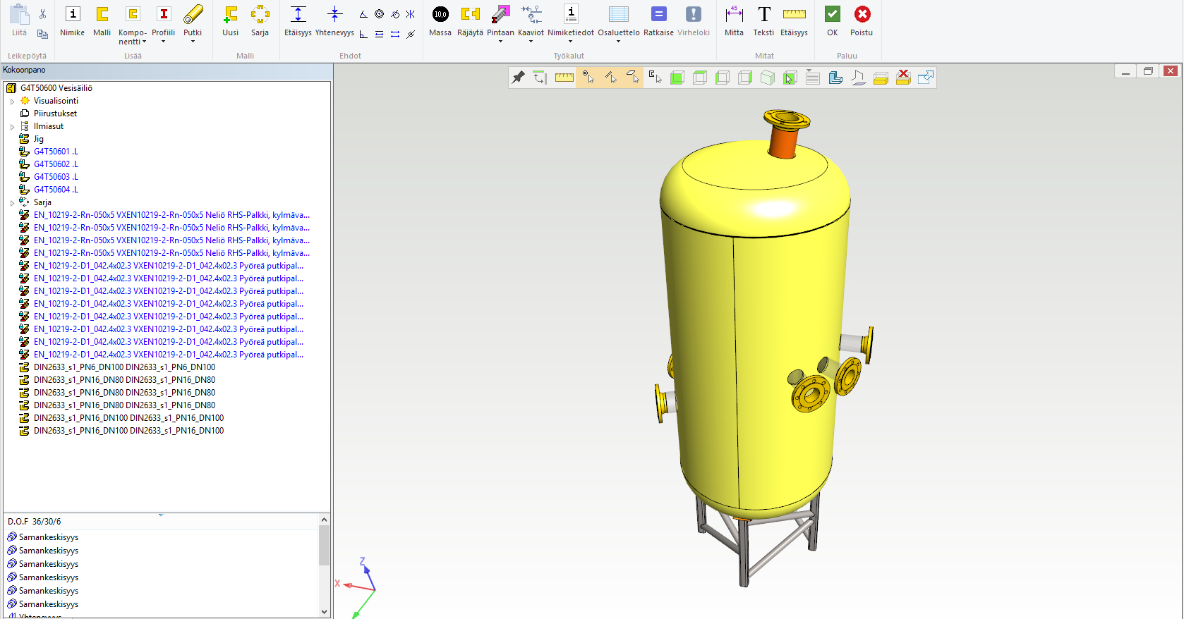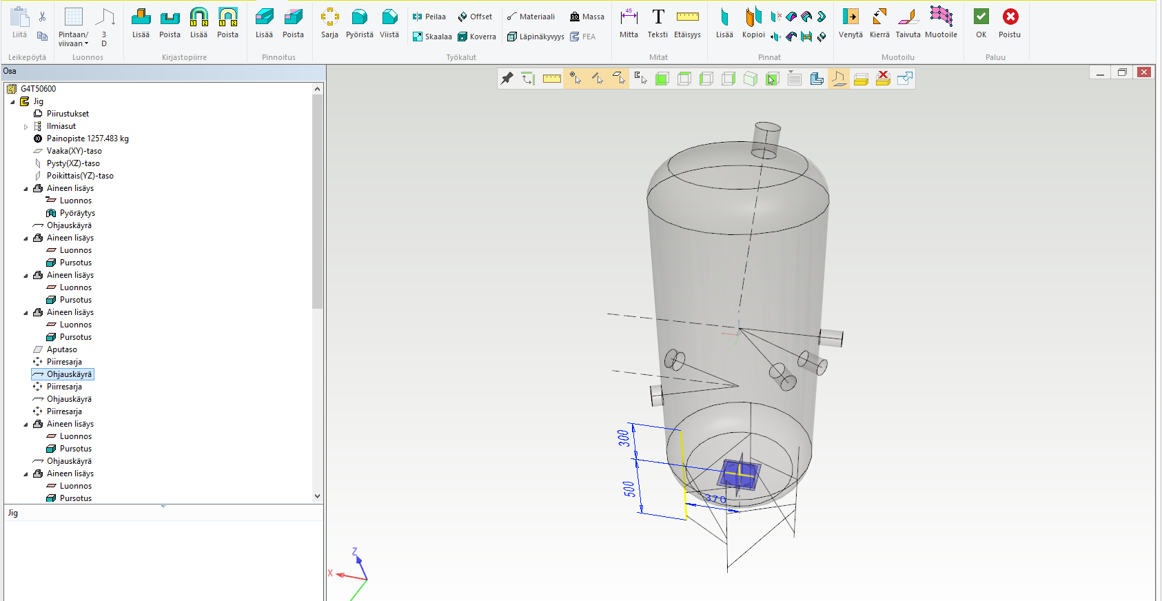 Säiliön osat tehdään samalla tekniikalla kuin kotelomaisissa levyrakenteissa, ts. tehdään uusi osa, kopioidaan siihen jigistä pinta tai pintoja ja offsetoidaan niistä levyosa. Jalkarakenne taas tehdään vetämällä profiiliosia ohjauskäyriä pitkin.