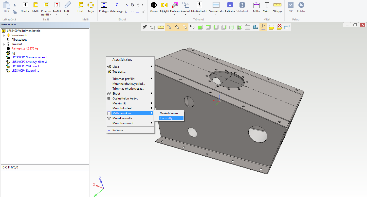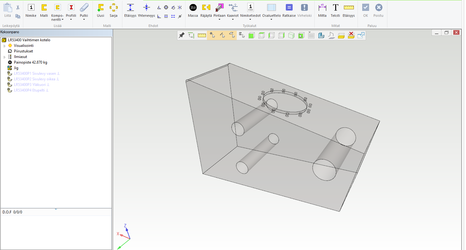 Koska jigiosa on tilavuusmalli, saat siitä massanlaskentatoiminnolla helposti myös tilavuuden lasketuksi. Tilavuushan on usein säiliöille oleellinen suunnittelukriteeri.