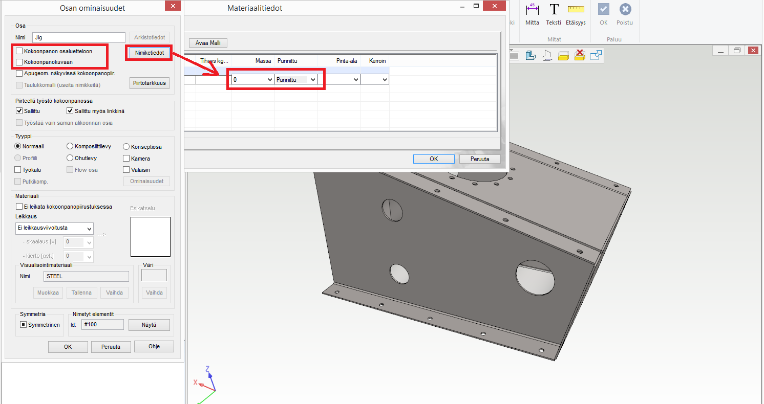 Huom: Jos käytössä on Flow-yhteys, jigiosa ei tule massanlaskentaan eikä osaluetteloon. Jos Flow-yhteyttä ei ole, on määritettävä jigiosalle, että sitä ei kerätä osaluetteloon ja massanlaskennassa sen massana käytetään nollaa.