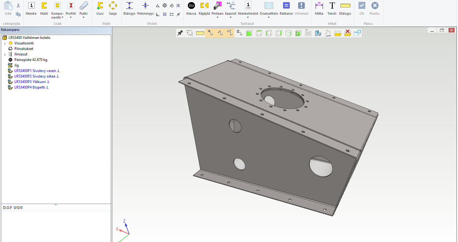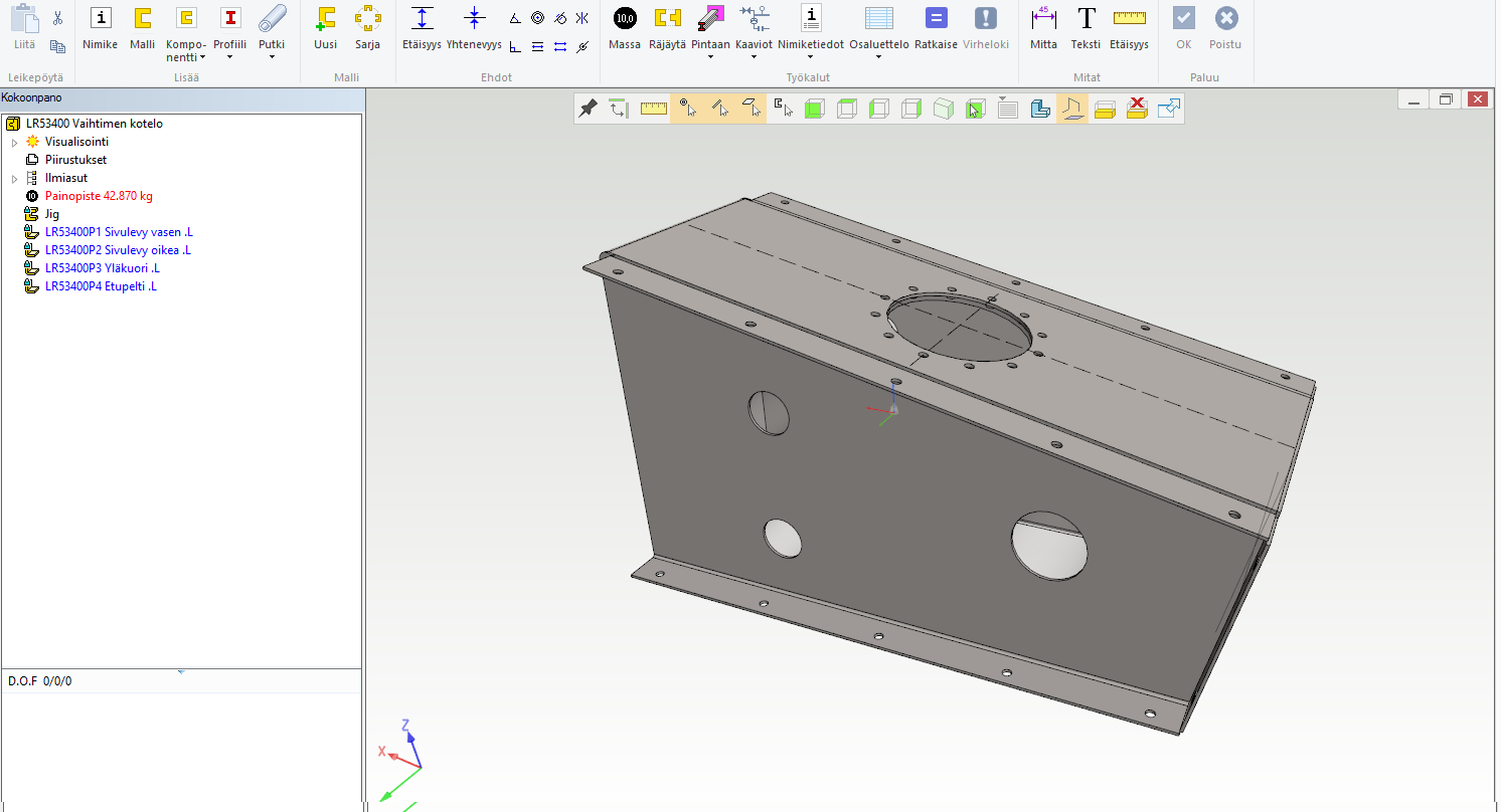 Tässäkin kannattaa aloittaa jigillä, joka kotelomaisissa rakenteissa voi olla tilavuusmalli. Näin rakenteen kuori saadaan helposti kopioimalla pintoja omiksi osikseen ja täydentämällä niitä sitten piirteillä. Osat sopivat aina toisiinsa ja kokoonpanon päämittoja muuttamalla (jigiosan muokkauksella) saadaan "Ratkaise"- toiminnolla osat päivittymään oikean mittaisiksi.