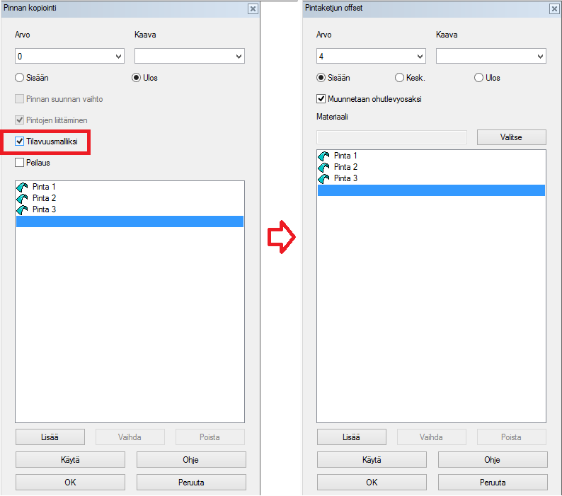 Kuva 5: Levyosan syntyminen jigiosan perusteella. "Tilavuusmalliksi" on valittava ensimmäisessä keskusteluikkunassa, jälkimmäisessä annetaan levyn paksuus sekä offsetin suunta. Muita piirteitä voi sitten levyosiin tehdä tarpeen mukaan, kuten esimerkin sivulaipat ja niihin kiinnitysreiät.