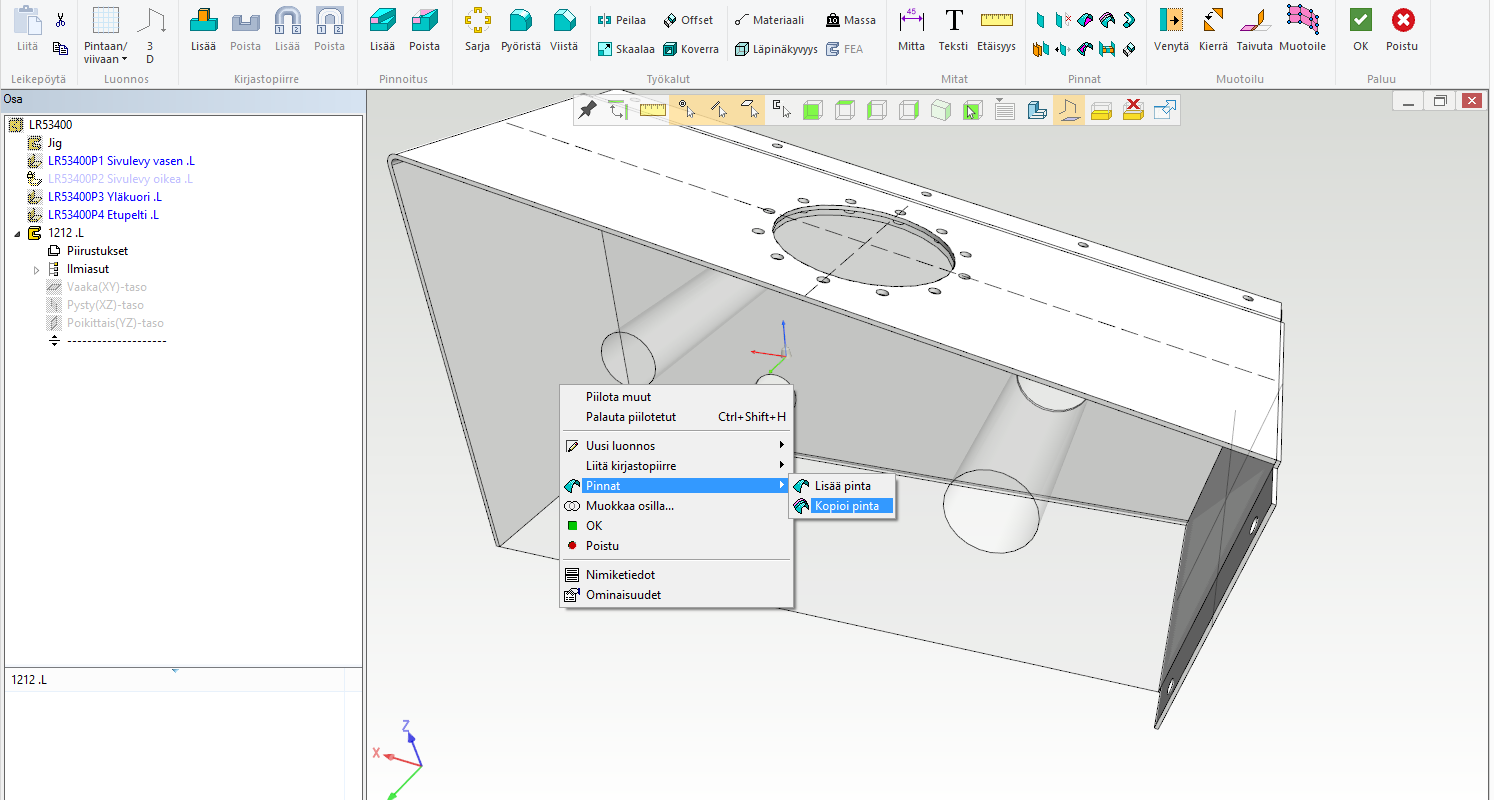 Itse levyosat mallinnetaan helposti perustamalla uusi osa, valitsemalla hiiren oikealla "Kopioi pintoja" ja pinnan valinnan jälkeen antamalla levynpaksuudet ja offsetin suunnat. Jos halutaan tehdä suoraan levyosa, jossa on taivutuksia, voidaan pyöristyksiä lisätä jigiosaan ja pinnan kopiointivaiheessa valita tangentiaalisuusoptio.