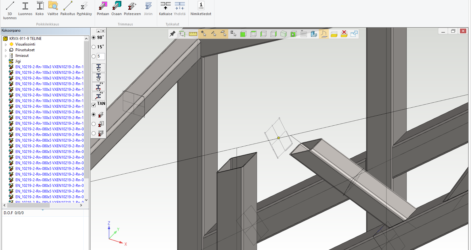Oletuksena profiilit ovat paikallisia osia, joista osaluetteloon tulee mm. profiilin tunnus ja pituus. Jos määrämittaan katkottuja profiiliosia valmistetaan varastoon, tallenna profiiliosa uudeksi dokumentiksi (valitse osa - hiiren oikealla "Tallenna uudeksi"). Tällainen osa seuraa edelleen jigiä, mutta siitä on nyt oma nimikkeensä, mallinsa ja mahdollinen työpiirustuksensa.