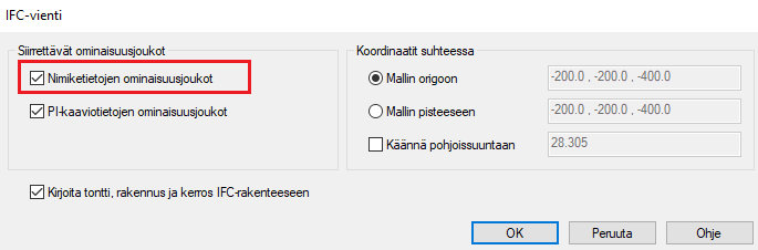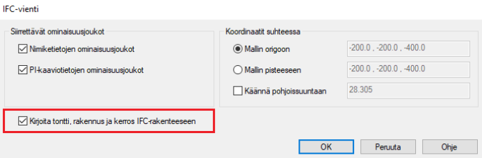 Vastaavasti IFC-viennissä voidaan standardin mukaiset tontti-, rakennus- ja kerrostiedot jättää tarvittaessa kirjoittamatta IFC-tiedostoon.