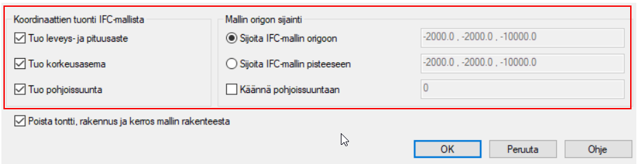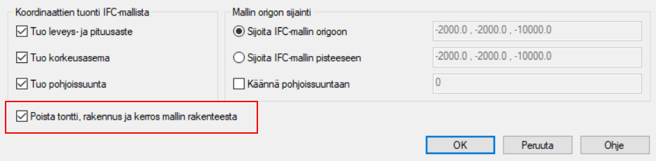 IFC-tuonnissa voidaan nyt valita mallin paikka ja asento. Kuten aiemmissakin versioissa, oletuksena mallin origo sijoitetaan siihen paikkaan, johon origo on IFC-tiedostoon kirjoitettu. Nyt mallin origo voidaan tarvittaessa sijoittaa myös muuhun paikalliseen pisteeseen.