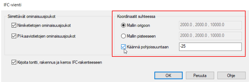 IFC-tiedostoon kirjoitettaviin koordinaatteihin ja kääntösuuntaan voi vaikuttaa asettamalla mallille maantieteelliset koordinaatit. Malli-ikkunassa tänne pääsee hiiren oikean napin takaa toiminnolla Muut toiminnot.