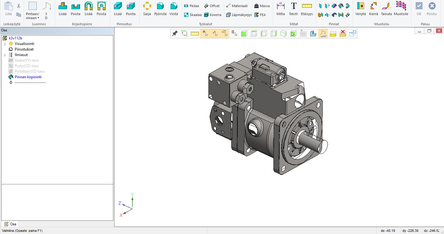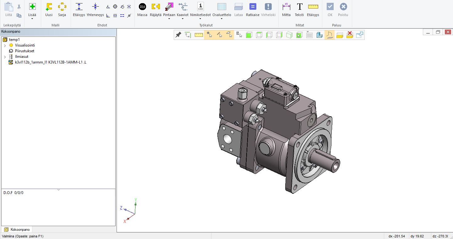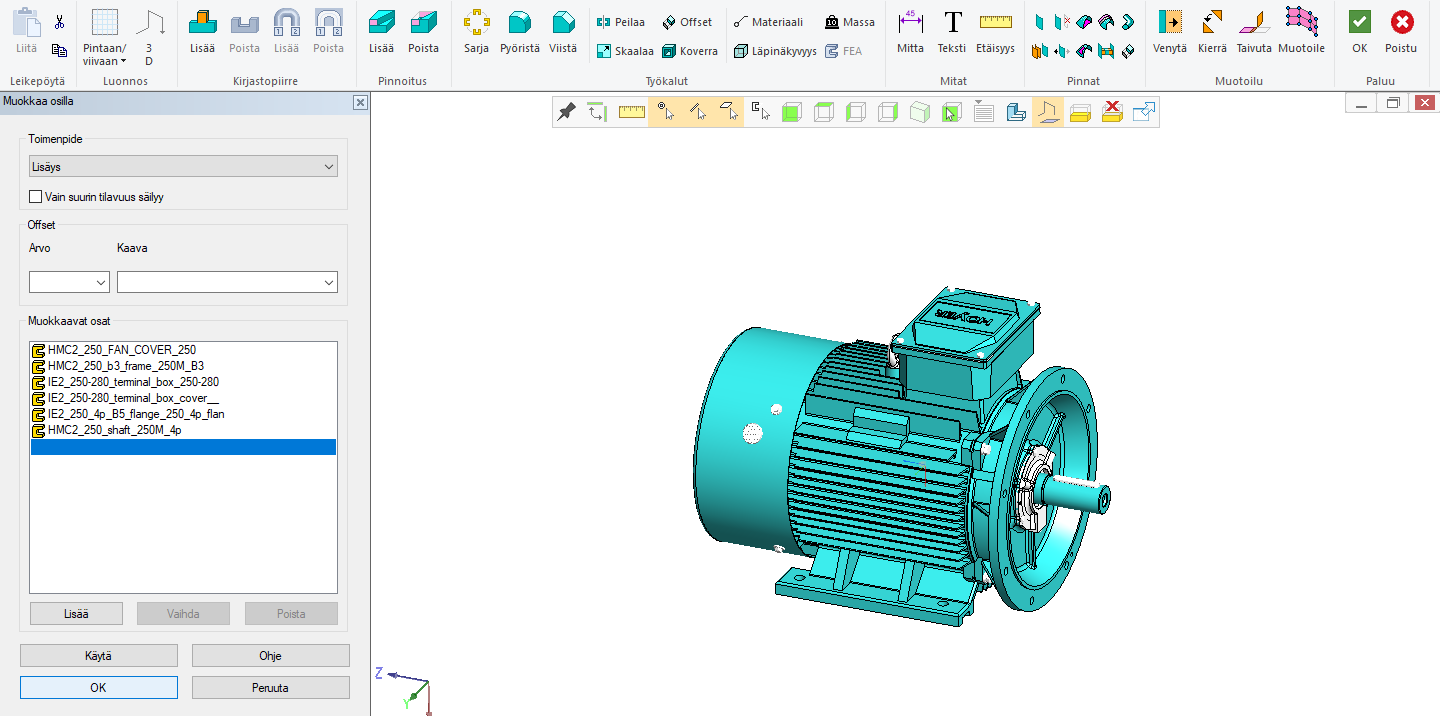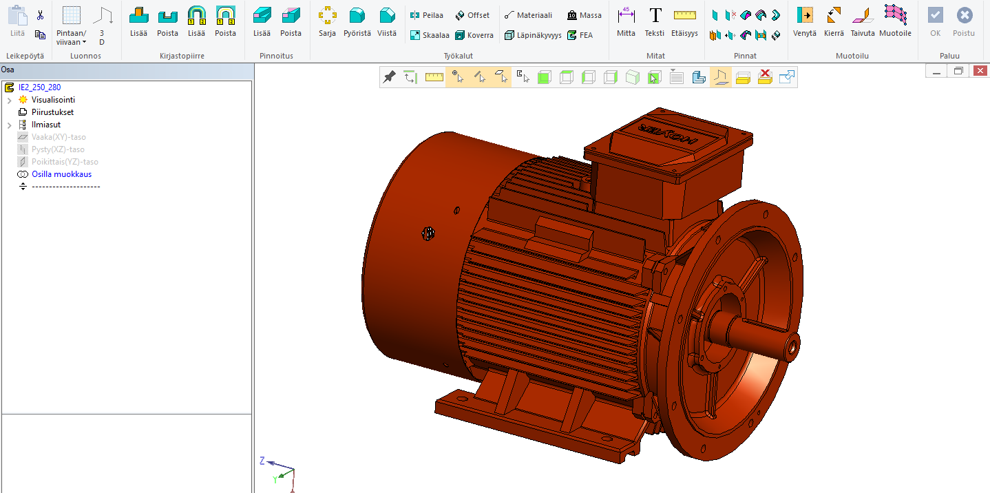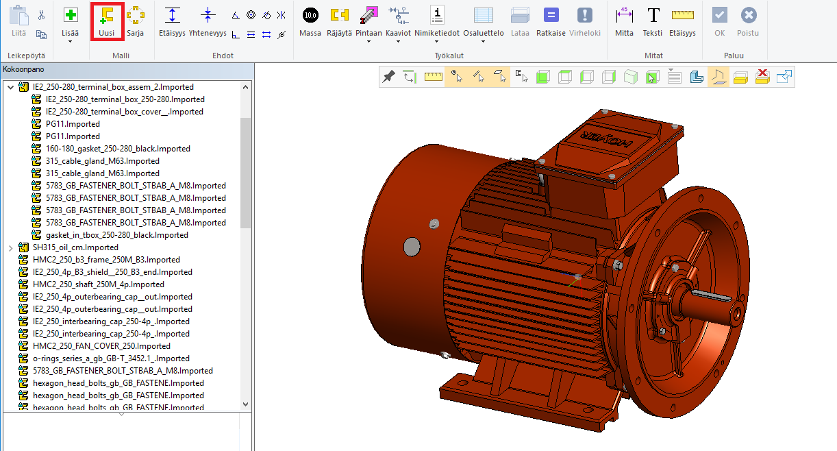 Kuva 1: Sähkömoottorin malli, jossa noin 100 osaa. Tee tässä kokoonpanossa uusi osa ja nimeä se esim. moottorin koodin mukaan.