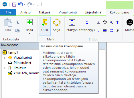 Kuva 1:Tee uusi kokoonpano (kuvassa "Temp1"), ja tuo em. malli siihen ensimmäiseksi osaksi.
