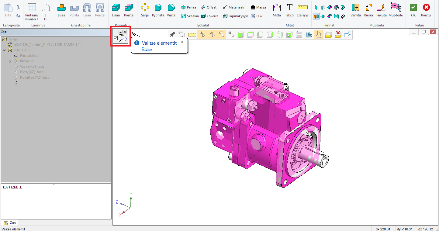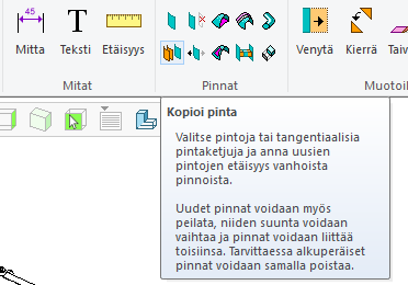 Kuva 4: Kopioi haluamasi pinnat alkuperäisestä osasta. Tangentiaaliset pintaketjut saat helposti valituksi käyttämällä kuvassa näkyvää pintaketjun valintaoptiota.