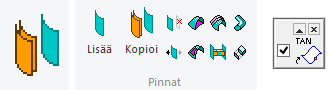 • Jos ikkunan vasemmassa yläkulmassa oleva optio Tangentiaaliset pinnat on valittu, ohjelma valitsee mukaan myös osoitetulle pinnalle tangentiaaliset pinnat.