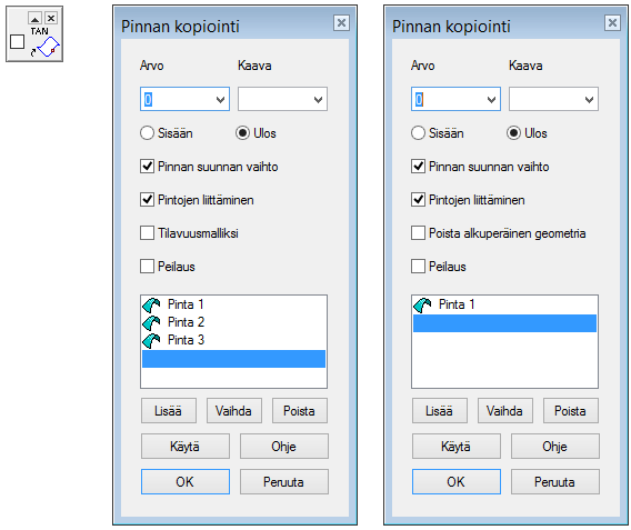 • Arvolla voi määritellä kopioidaanko pinta samalle kohdalle alkuperäisen pinnan kanssa, vai arvon mukaisen matkan päähän.