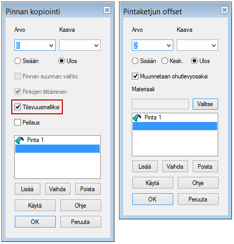 Jos Pinnan kopioinnoin yhteydessä halutaan tehdä saman tien ohutlevykappale, niin valitse optio Tilavuusmalliksi.