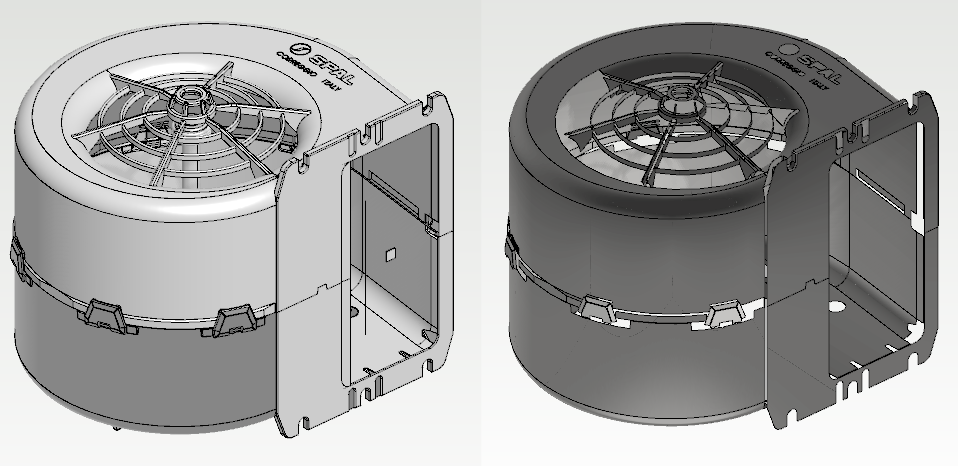 Vasemmalla Step-mallista käännetty Vertex-kokoonpanomalli ja oikealla osamalli, johon on kopioitu em. koonnasta pintoja.