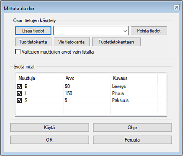 Voit antaa mittamuuttujille kuvaukset, jotta niiden tunnistaminen isossa kokoonpanossa on helpompaa.
