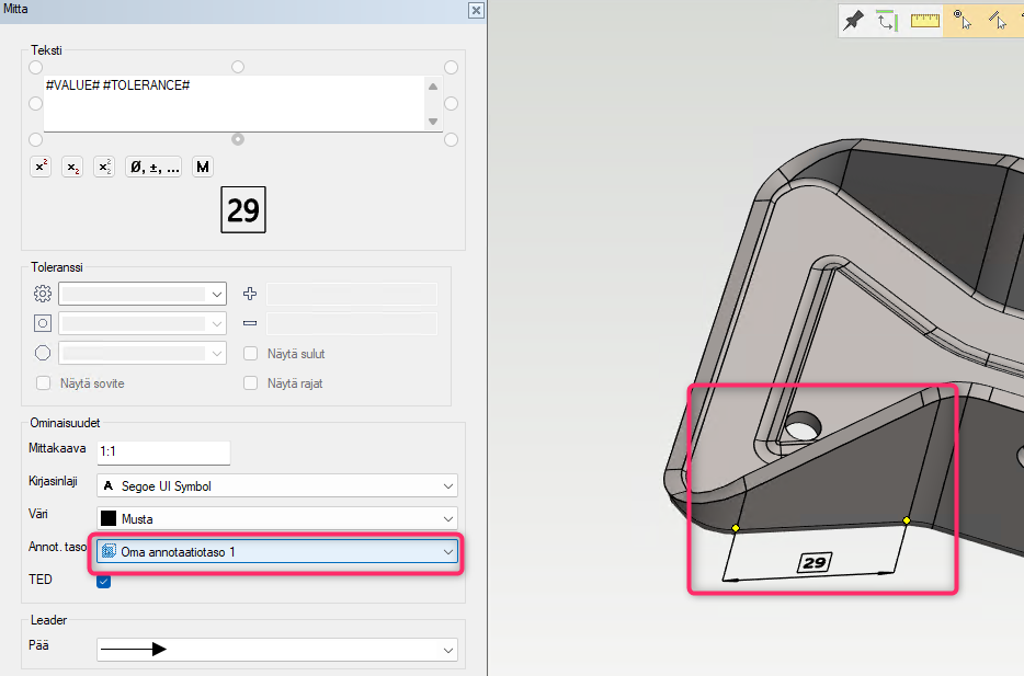 Voit mitoittaa MBD-mittojen ja -merkintöjen ominaisuuksiin pohjautuen hyödyntäen annotaatiotasoja ja dynaamista näkyvyyttä. Voit lisäksi käyttää uusien mittojen kanssa tekstimakroja.