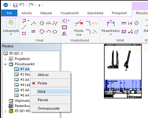 Kun valitset lomakkeen puusta ja valitset “Siirrä” tai “Poista”, nämä toiminnot kohdistuvat myös lomakkeen projektioihin. Näin voit helposti järjestellä lomakkeita piirustuspohjalla.