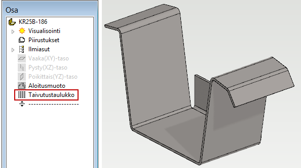- Jos tuodun kappaleen geometria on puutteellinen tai ohutlevyksi virheellinen, niin voit muokata kappaletta ensin toiminnoilla joita on esitelty lopussa kohdassa "Muutamia vinkkejä, joiden avulla mallia voi esikäsitellä ennen taivutustaulukon käsittelyä".
